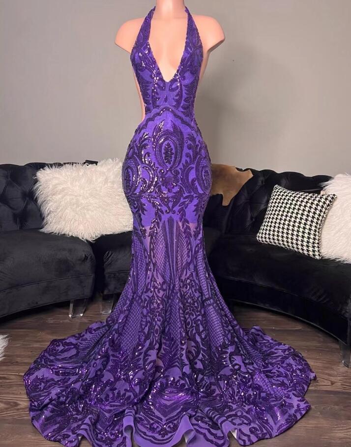 Sparkly Halter Purple Mermaid Sequin Prom Dresses