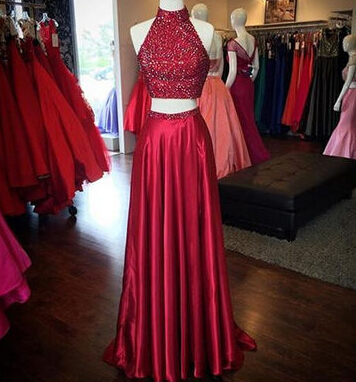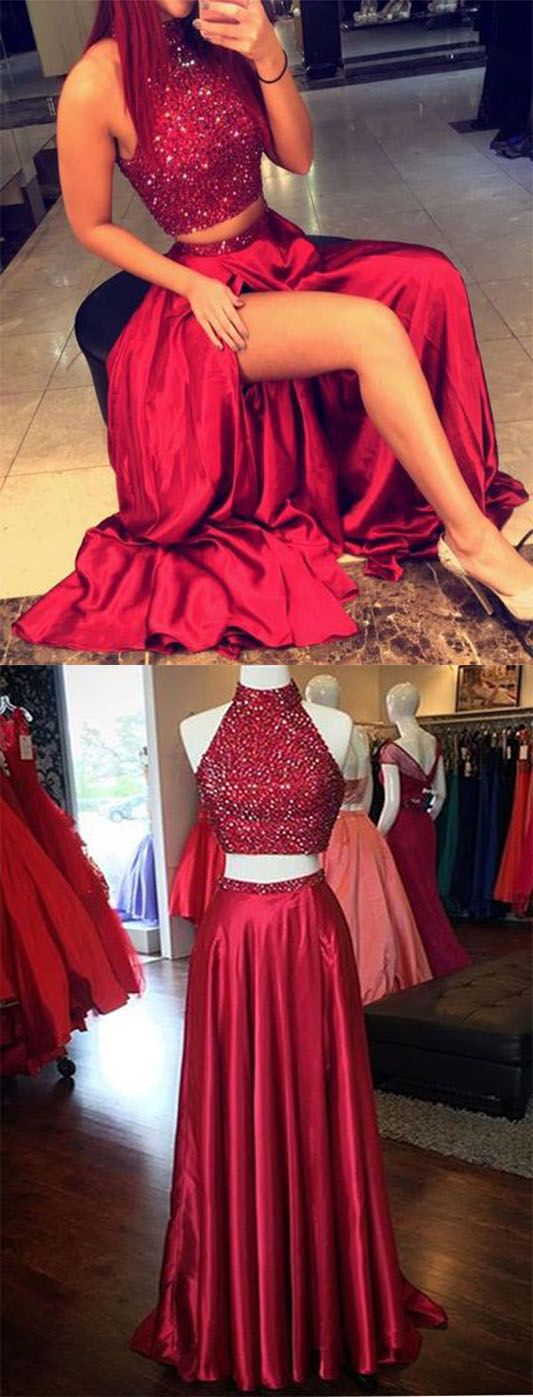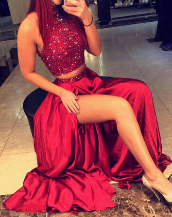 Red Sequins prom dress,beading prom/evening dress,High-Slit Taffeta Two Pieces Prom Dresses 2017