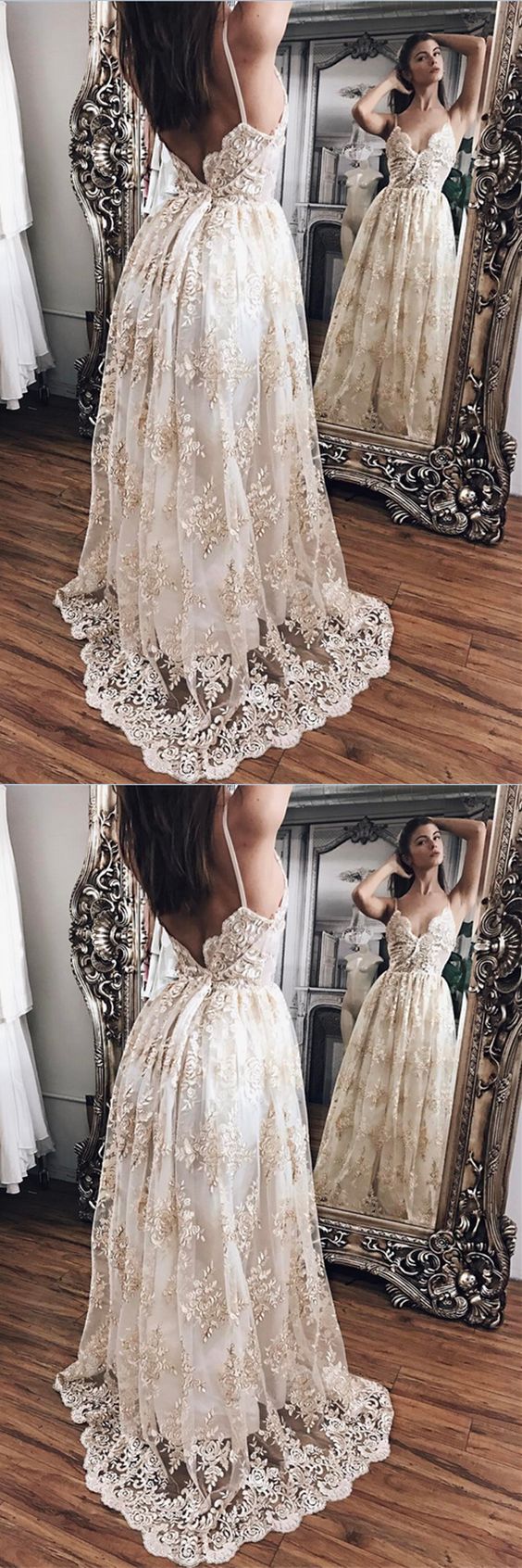 A-Line Spaghetti Straps Champagne Lace Long Prom Dress,sexy prom dress