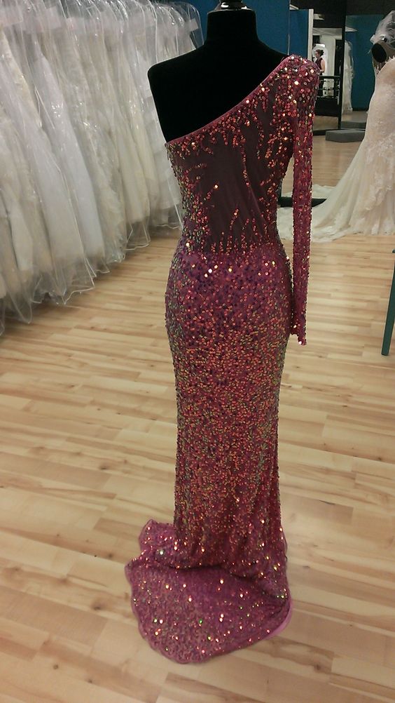 Sparkle Sequins Prom Evening Dress,One Long Sleeves Unique Prom Dress,Side Split Charming Prom Dress