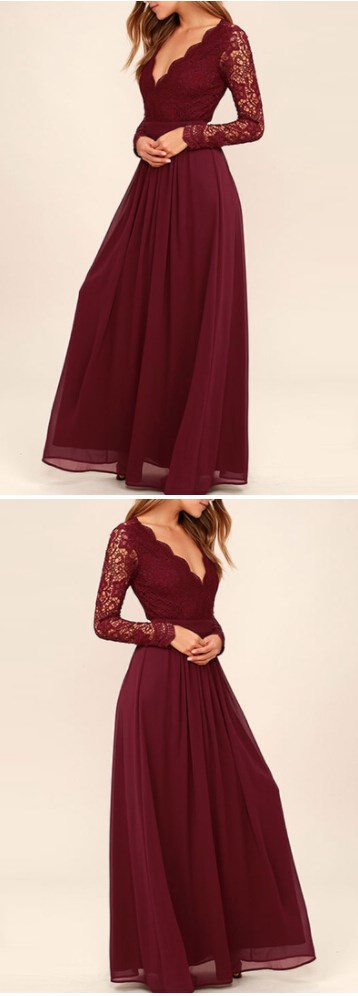 Lace Burgundy Chiffon Bridesmaid Dresses,Beautiful Simple Prom Dress with Long Sleeves