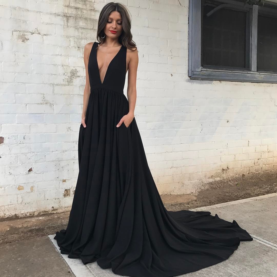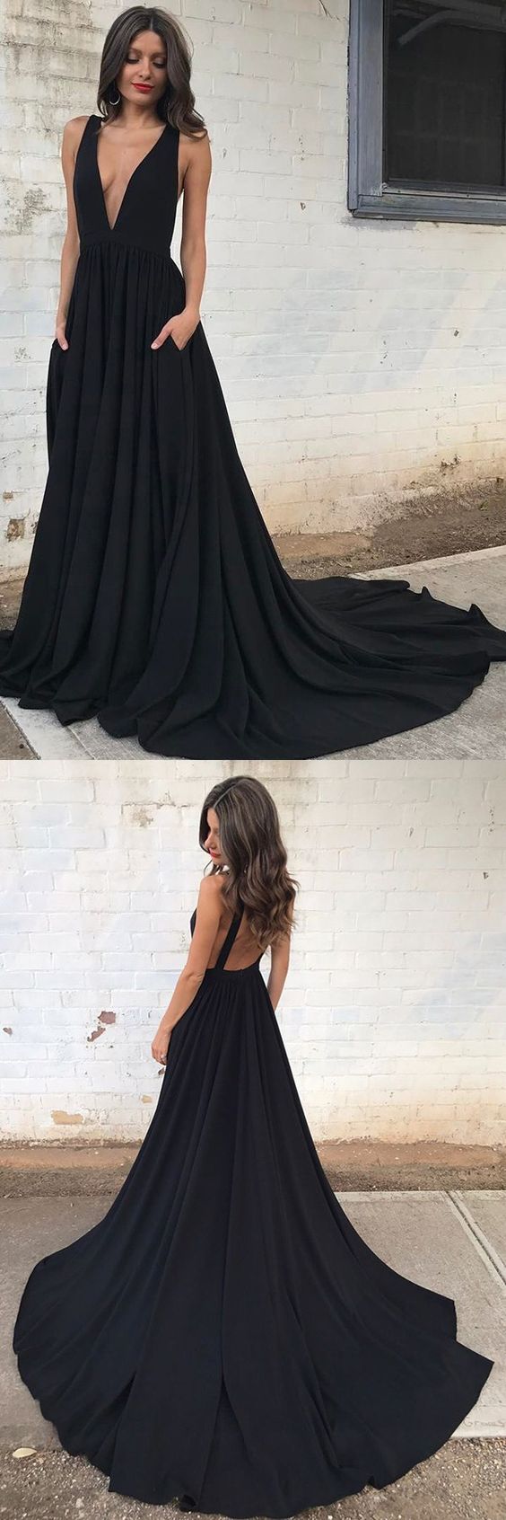 Sexy Deep V Neck Prom Dress , Chiffon Black Long Prom Dress with Train