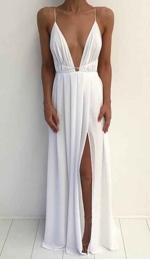 Floor Length White Chiffon Deep V Neck Side Slit Long PromDress, Prom Dress, Party Dresses