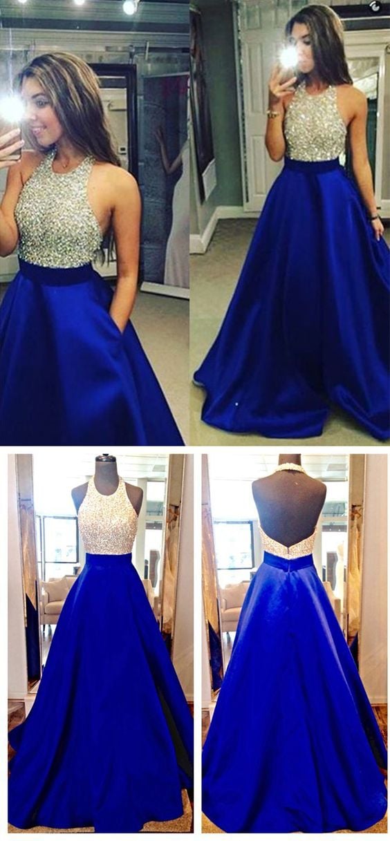 Royal Blue Long Prom Dresses,Bodice Beads Evening Prom Dress Ball Gown With Pocket Formal Women Dress,Graduation Dress