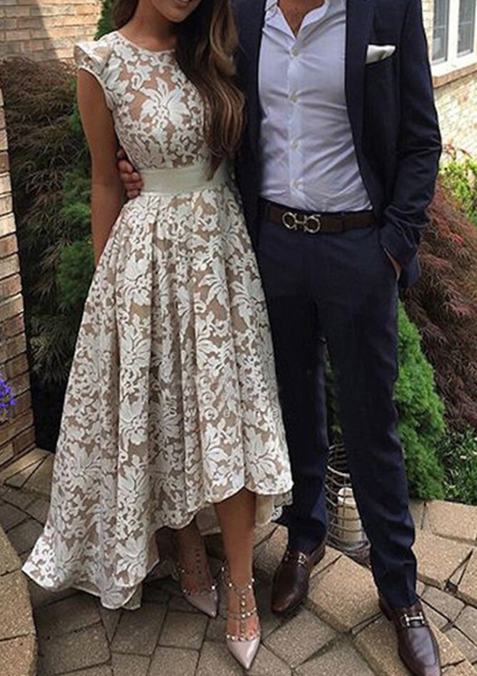 Elegant A-Line Scoop Sleeveless Prom Dress Sash Hi-Lo Lace Prom Dress