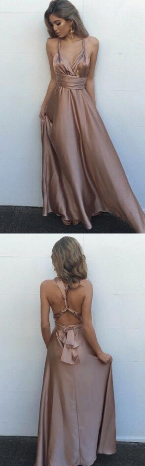 Beauty Sexy Simple Sleeveless Floor Length Prom Dress,V-Neck Criss-Cross Straps Blush Prom Dress with Pleats