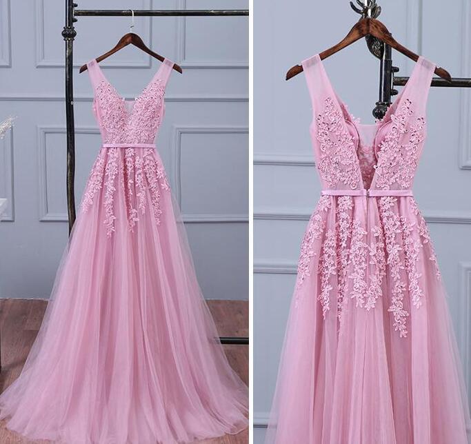 Pink Long Lace prom Dresses,Sexy V Neck Prom Dresses,Elegant Formal Dresses for Weddings