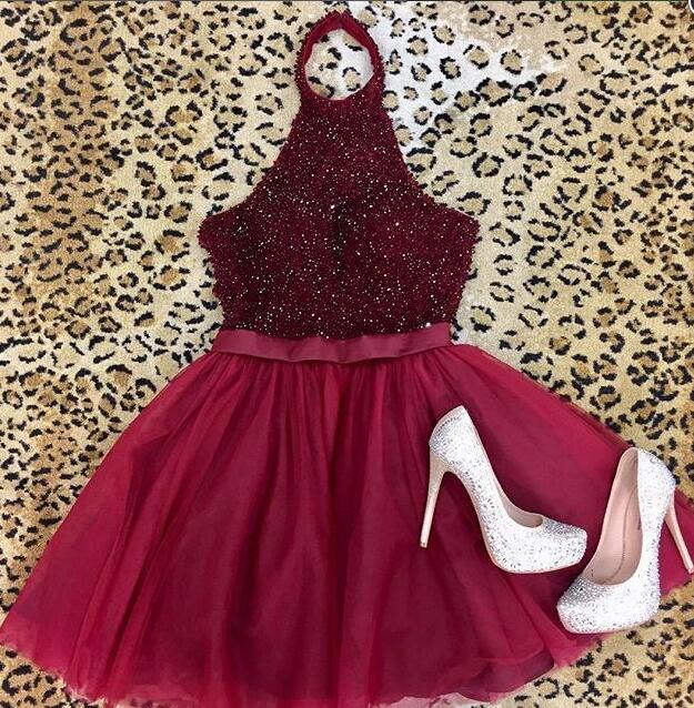 Cute Burgundy Tulle A Line Backless Homecoming Dress with Beading