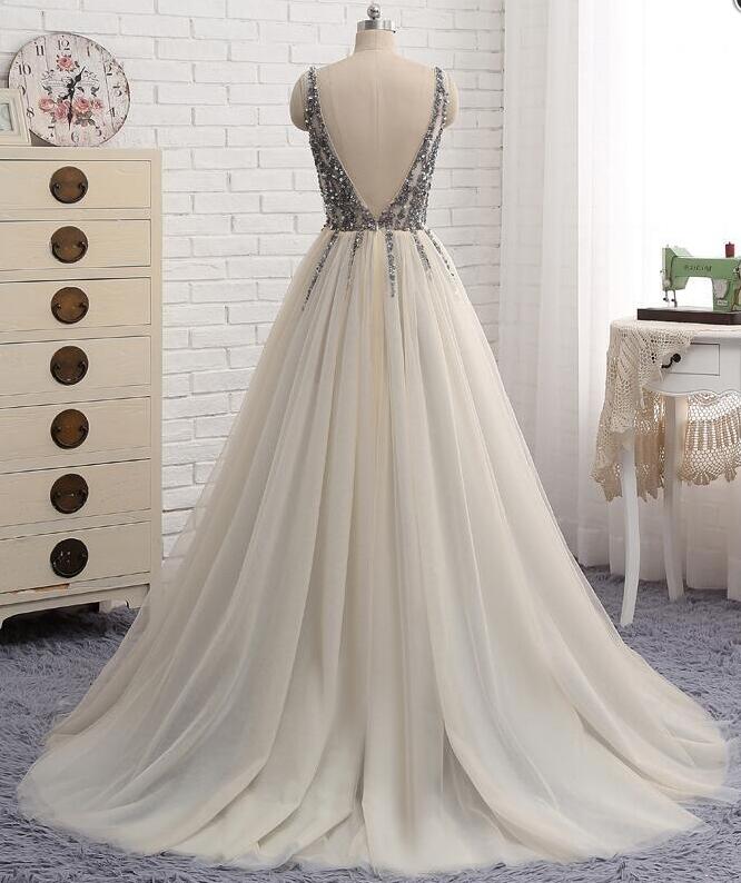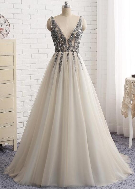 A Line Gray V-Neck Long Tulle Backless Prom Dress With Beading