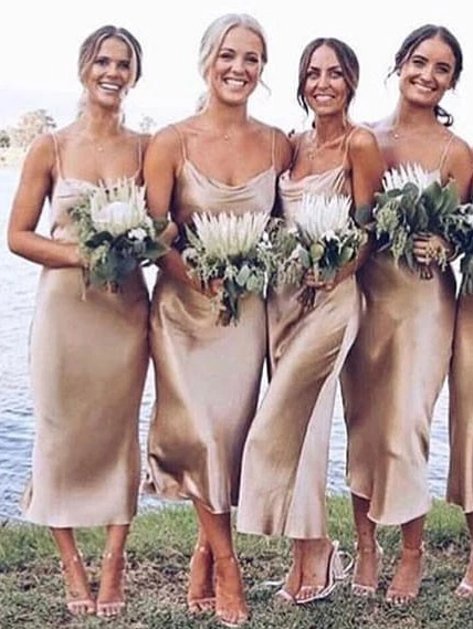 Sheath Spaghetti Straps Champagne Satin Bridesmaid Dress