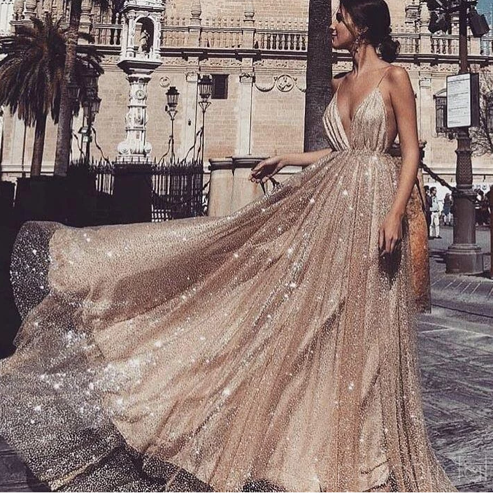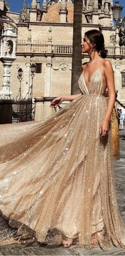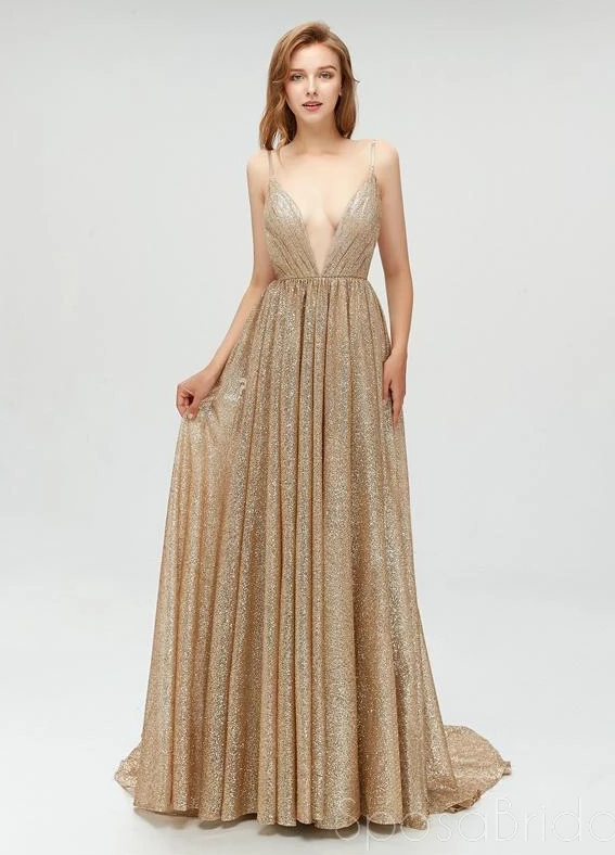 Spaghetti-Straps Gold Sequin Prom Dress,Sexy Evening Gowns