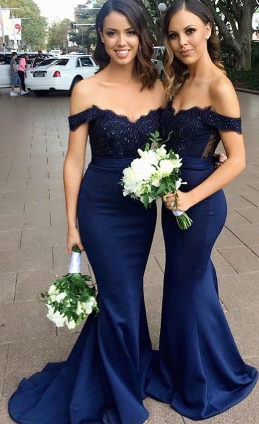 Off the Shoulder Navy Mermaid Prom Dresses with Appliques