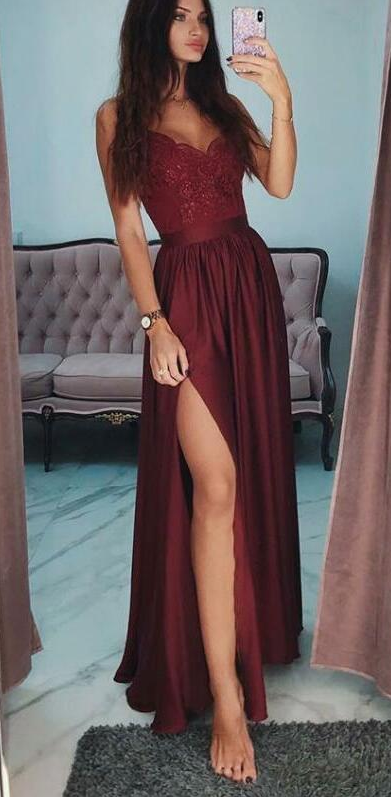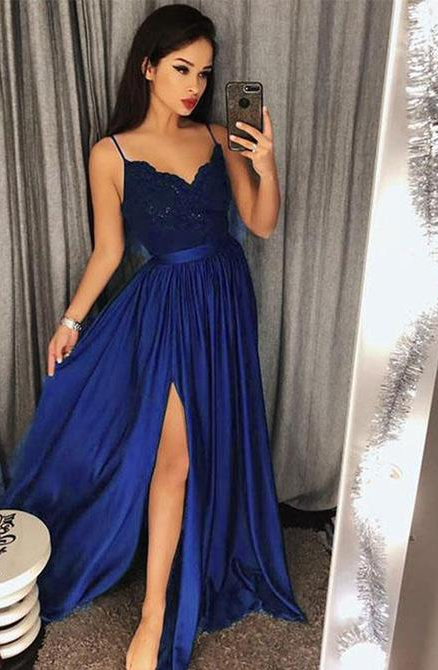 Spaghetti Straps A-Line Modest Long Prom Dresses,Side Split evening dress