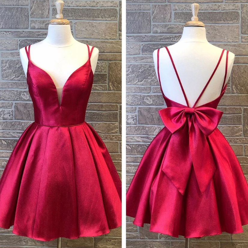 Simple V Neck Wine Red Homecoming Dress with Bow,Short Prom Dress