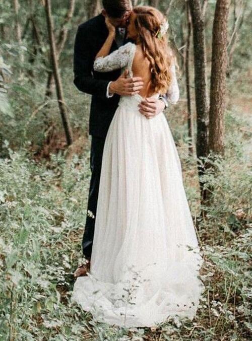Half Sleeves V Neck Backless Wedding Dresses with Lace Appliques