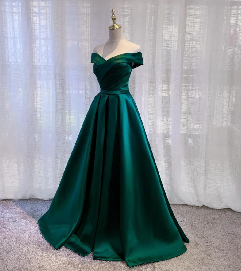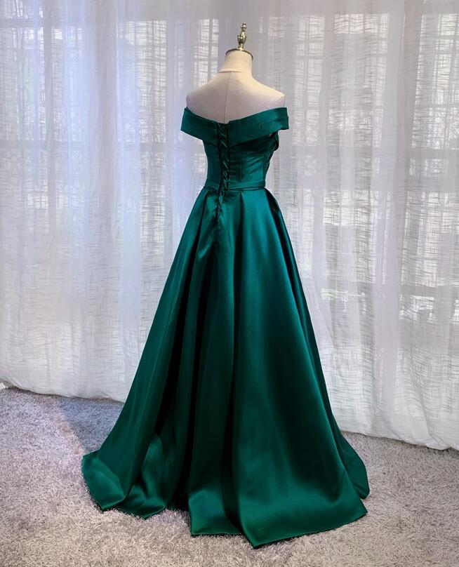 A-Line Off-shoulder Satin Emerald Green Prom Dresses