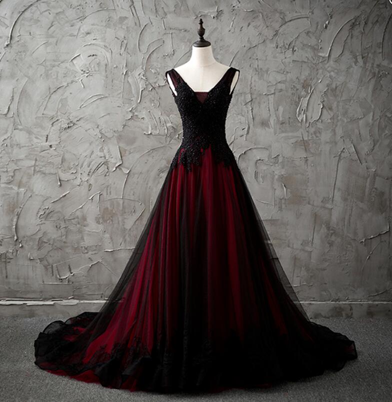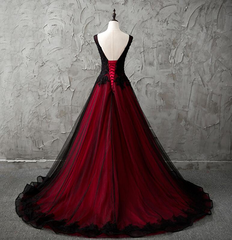Chic V-Neck Sleeveless Black and Red Prom/Wedding Dresses Lace Appliques