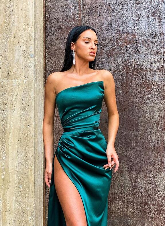 Sexy Mermaid Dark Green Split Satin Prom Dresses, Party Dresses