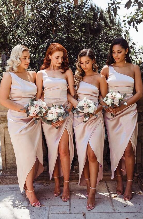 Simple One Shoulder Satin Champagne Bridesmaid Dresses