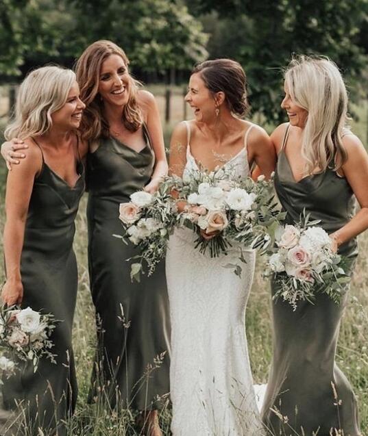 Spaghetti Straps Olive Satin Cowl Neck Long Bridesmaid Dresses For Wedding