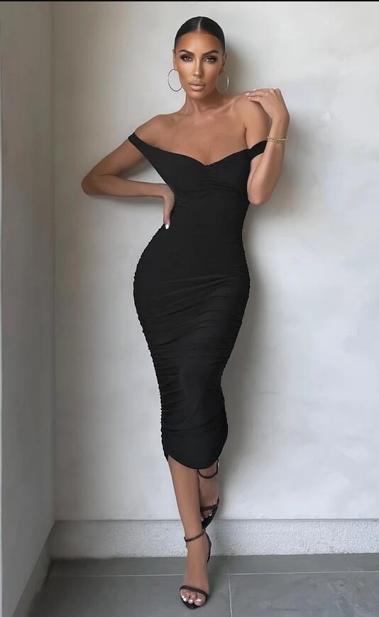 Off the Shoulder Tea Length Sexy Bodycon Black Prom Evening Dresses