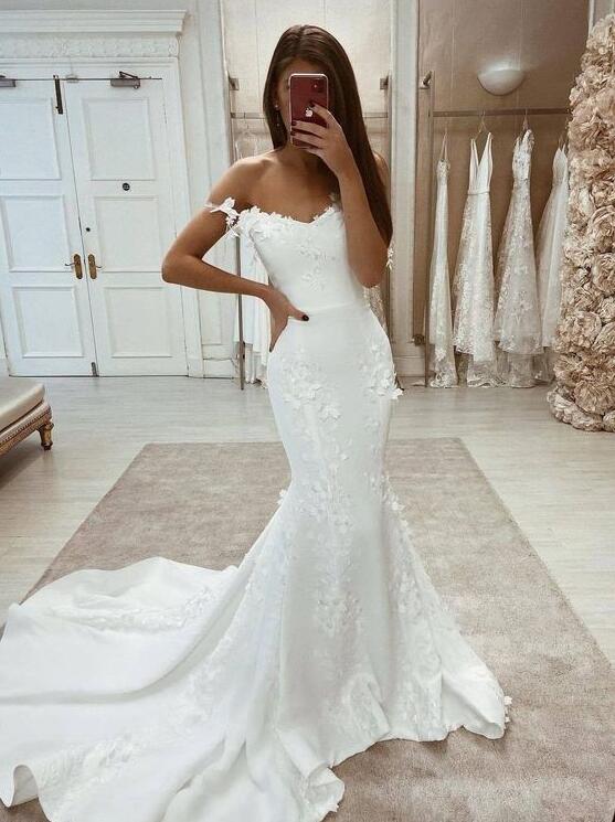 Off the Shoulder Soft Satin Wedding Dresses with Lace Appliques