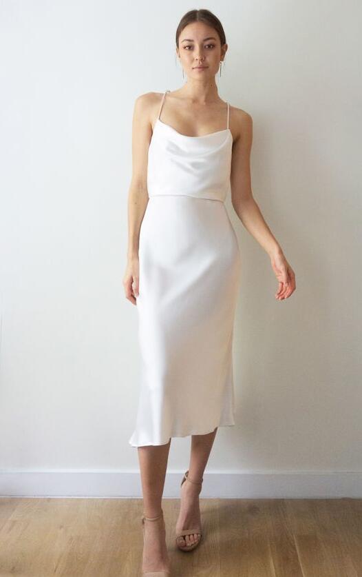 Simple Cowl Neck White Silk Satin Tea Length Prom Dress