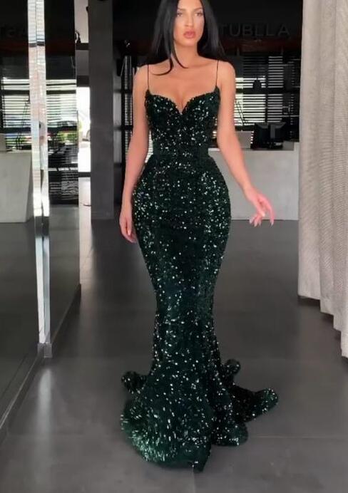 Sweetheart Spaghetti Straps Dark Green Sequin Long Evening Dresses