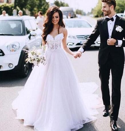 Elegant Spaghetti Strap Court Train A-Line Lace Wedding Dresses