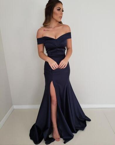 Off the Shoulder Sweetheart High Slit Navy Blue Long Prom Evening Dresses