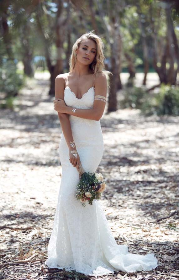 Mermaid V Neck Spaghetti Straps White Lace Wedding Dresses