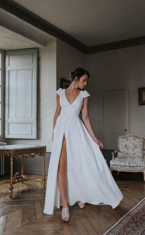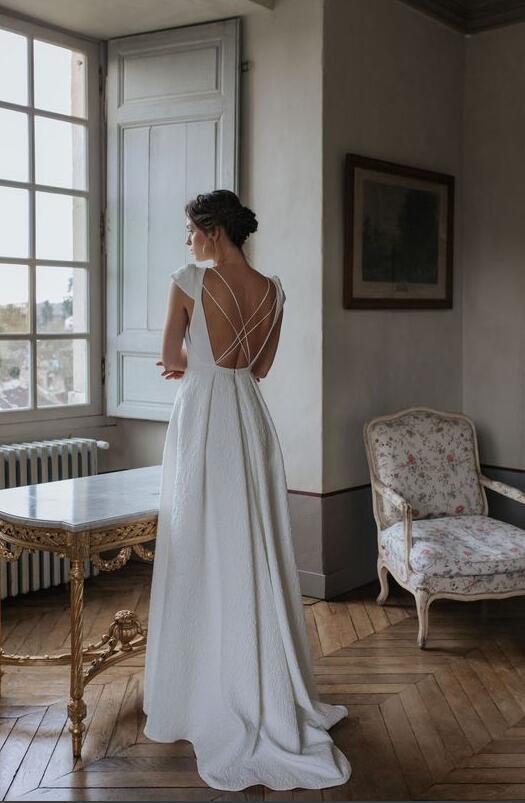 Vintage Cap Sleeve Cross Back Satin Wedding Dresses