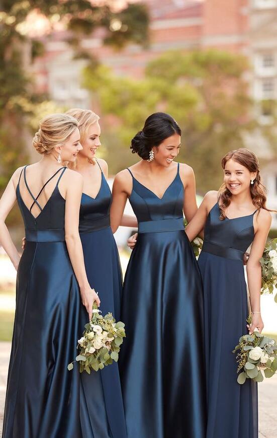 Charming V Neck Navy Blue Long Satin Bridresmaid dresses