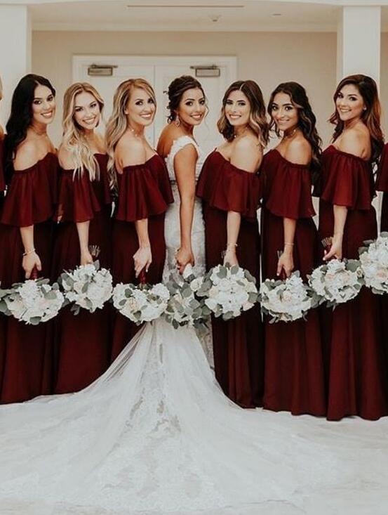 Off the Shoulder Floor Length Burgundy Chiffon Bridesmaid Dresses
