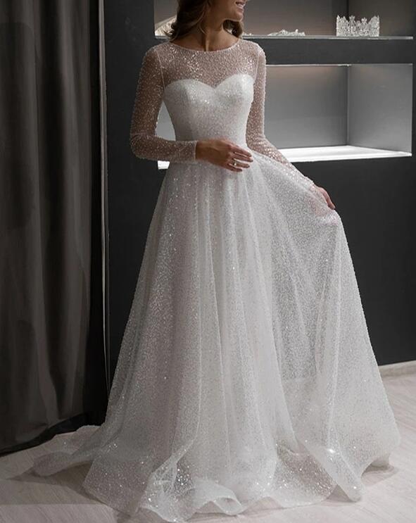 A-Line Long Sleeves Round Neck White Sequins Wedding Dresses Bridal Gowns