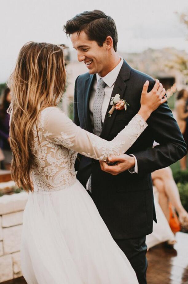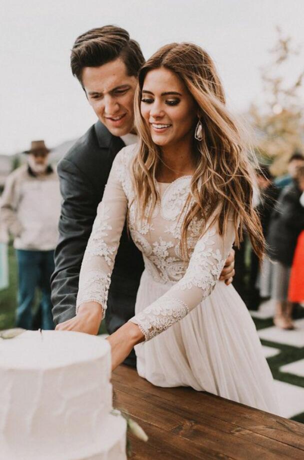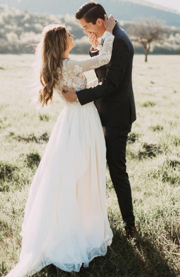 Charming Bateau Long Sleeves Chiffon Wedding Dress with Lace Appliques