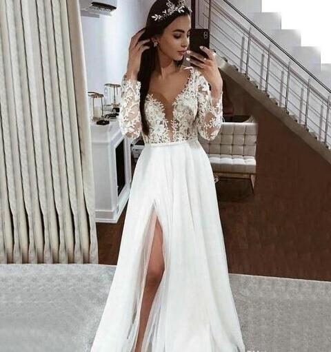 A Line Long Sleeve Boho Tulle Wedding Dresses with Lace Appliques Side Slit