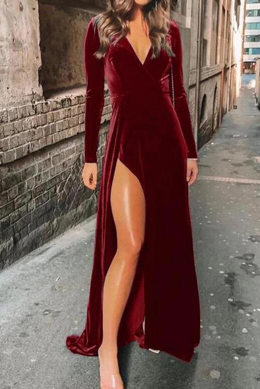 Sexy Wine Red Velvet Split-Front Long Sleeve Evening Dress