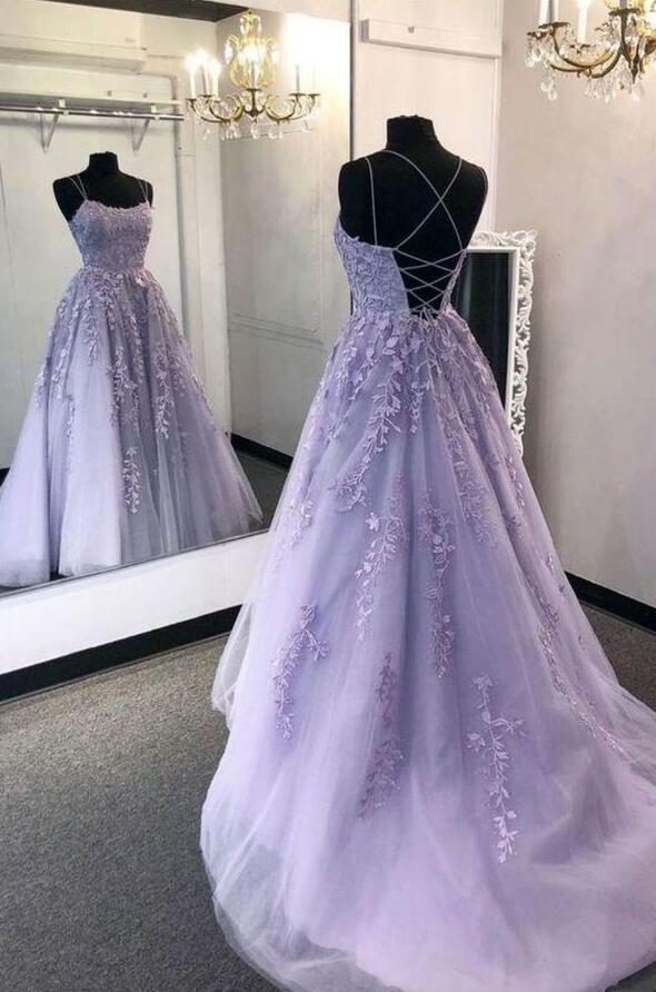 Spaghetti Straps Lavender Tulle Applique Prom Dresses