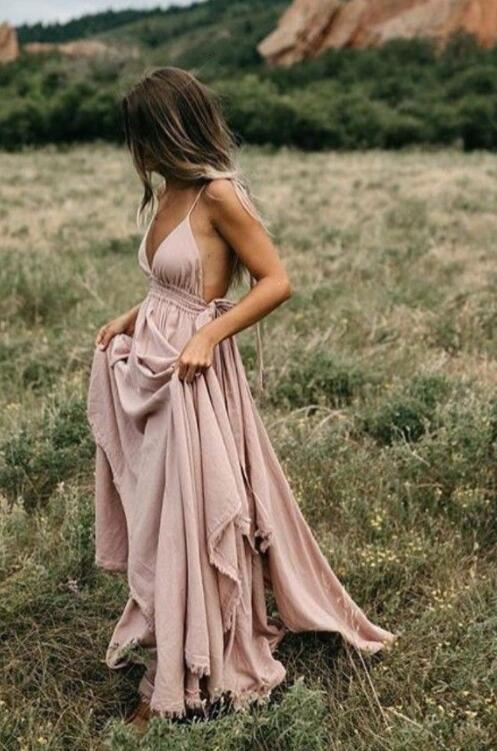 Spaghetti Straps V-neck Pink Long Prom Dresses,Party Dresses