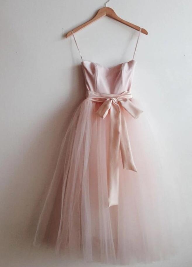 Lovely Pink Straps Tull Tea Length Party Dress, Formal Dress for Wedding
