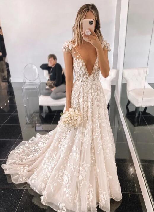 Charming v neck tulle applique long wedding dress