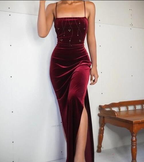 Sexy Burgundy Velvet Slit Long Prom Dress Eveing Dress