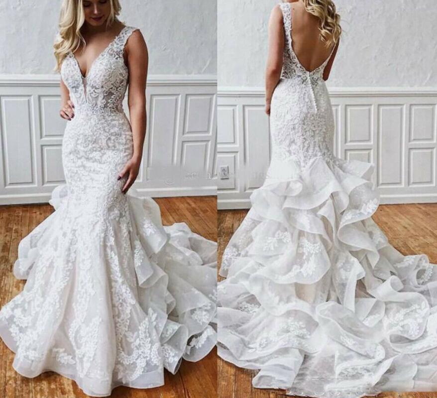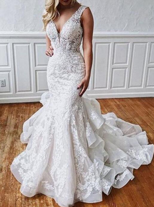 Sexy Mermaid Sheer Ruffles Sleeveless V-Neck Lace Wedding Dresses