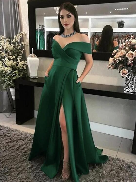 Elegant Off Shoulder A Line V Neck Prom Dress With High Slit