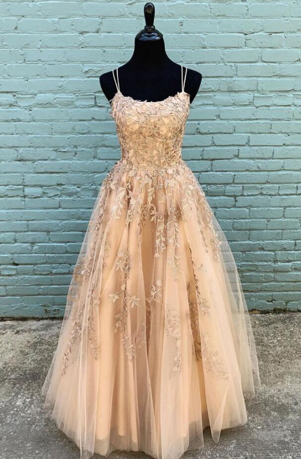 FLOOR LENGTH CHAMPAGNE TULLE LACE LONG PROM DRESS, CHAMPAGNE FORMAL DRESS