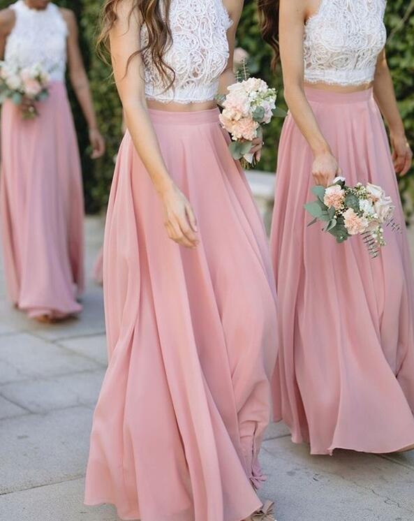 SImple Two Piece Long Chiffon Bridesmaid Dresses Top with Lace