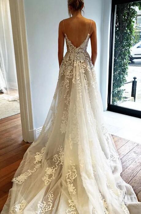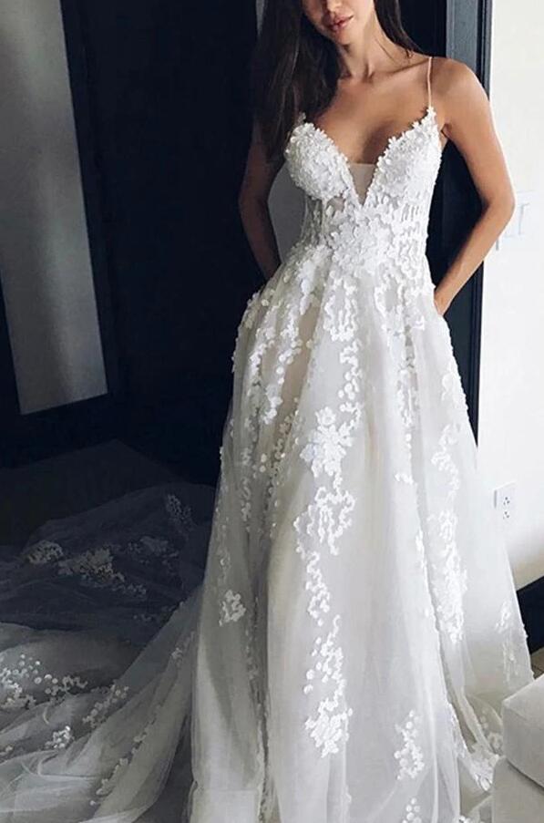 Spaghetti Straps Deep V neck Ivory Lace Wedding Dress,Beach Wedding Dress