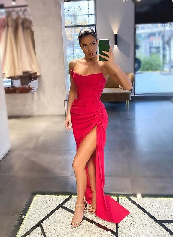 Mermaid Strapless Hot Pink Prom Dresses with Slit
