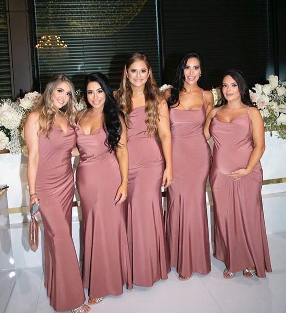 Spaghetti Straps Elegant Sheath Cowl Neck Blush Bridesmaid Dresses